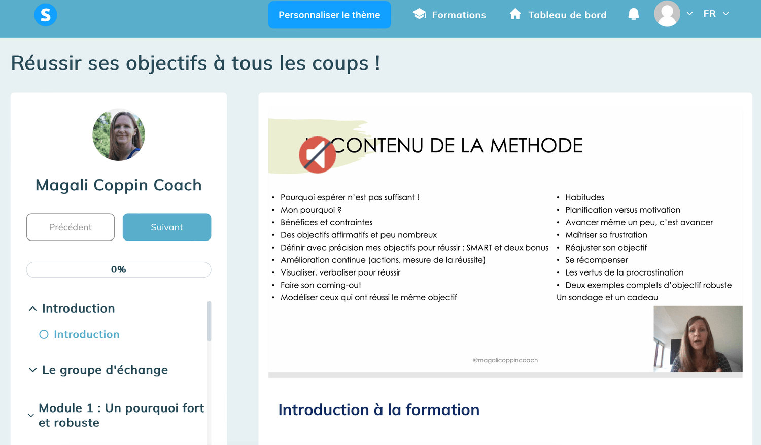 Cette formation est complètement en ligne et disponible à vie. Si le groupe de discussion convient d'un module supplémentaire, il sera mis en ligne pour l'ensemble des participantes sans surcoût.